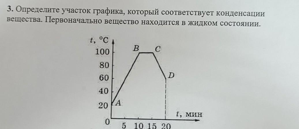 В участке АБ судя по графику идет нагревание,затем испарение жидкости. После испарения жидкость охлаждается,что означает что он из пара переходит в жидкость,что и называется конденсацией.