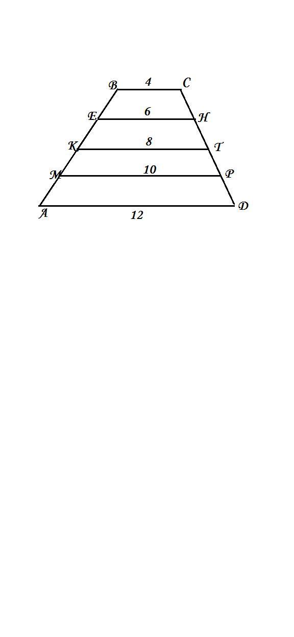 3. [4 балла]. Боковая сторона трапеции разделена на четыре равные части и из точек деления проведены к другой стороне отрезки, параллельные основаниям. Найдите длины этих отрезков, если основания трапеции равны 4 м и 12 м.ДАЮ 90ЮАЛОВ