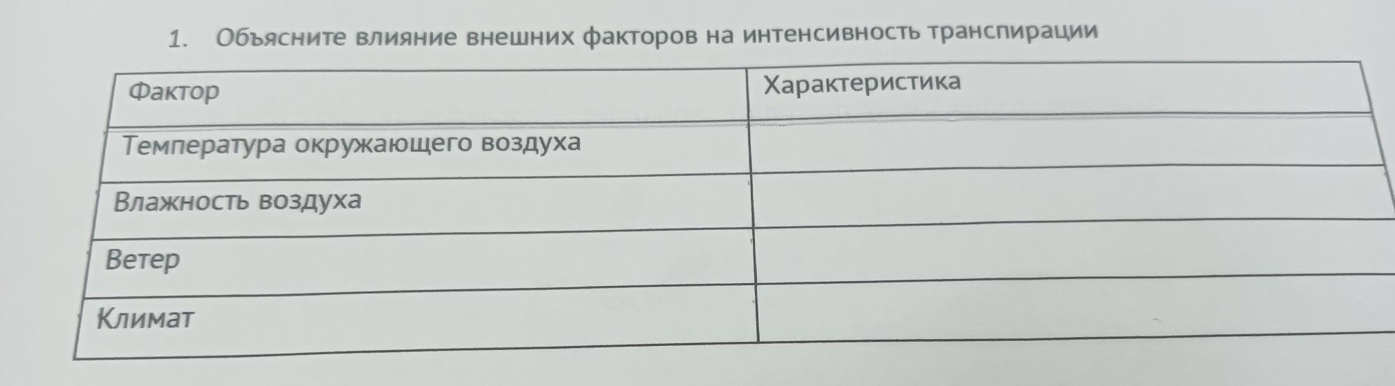 1. Объясните влияние внешних факторов на интенсивность транспирации Фактор Характеристика Температура окружающего воздуха Влажность воздуха Ветер Климат
