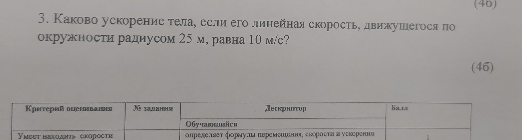 3. Каково ускорение тела, если его линейная скорость, движущегося по окружности радиусом 25 м, равна 10 м/с? (46)
