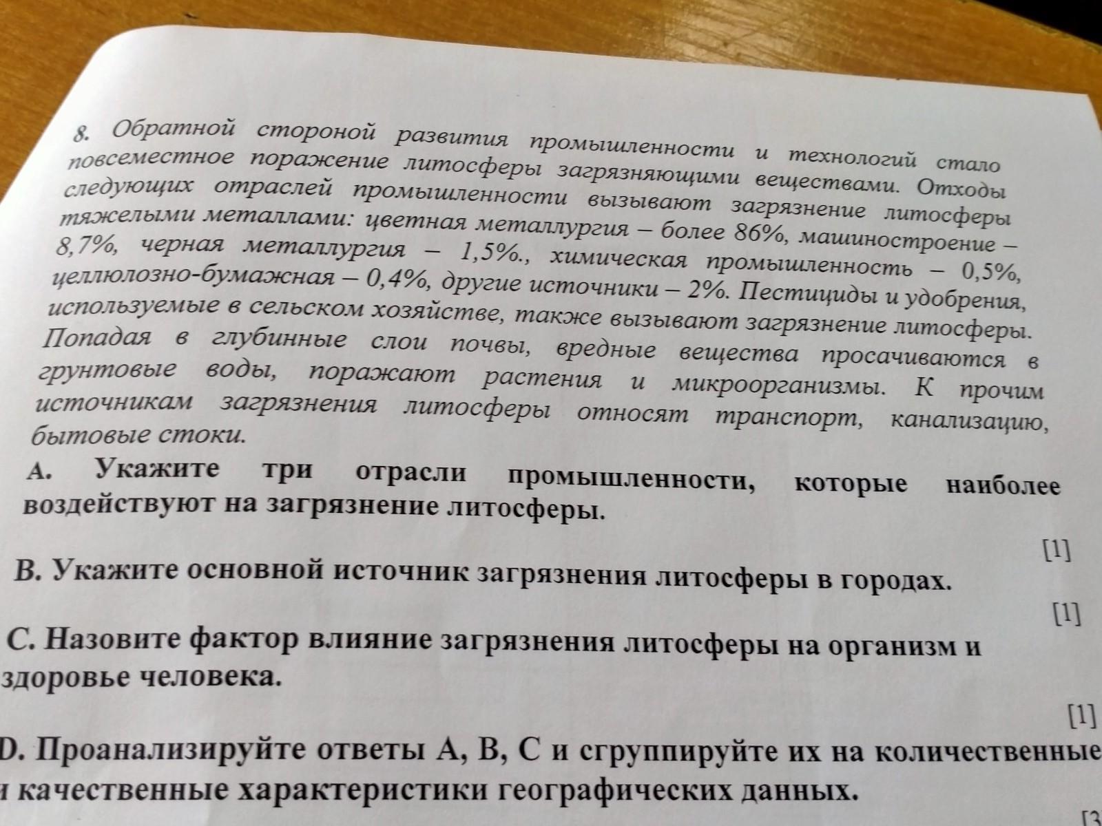 8. Обратной стороной развития промышленности u технологий стало повсеместное поражение литосферы загрязняющими веществами. Отходы следующих отраслей промышленности тяжелыми металлами: цветная металлургия - вызывают загрязнение литосферы более 86%, машиностроение - - 8,7%, черная металлургия целлюлозно-бумажная А. 1,5%., химическая промышленност - 0,5%, 2%. Пестициды и удобрения, - используемые в сельском хозяйстве, также вызывают загрязнение литосферы. Попадая в глубинные слои почвы, вредные вещества просачиваются 6 поражают растения U микроорганизмы. грунтовые воды, загрязнения литосферы относят транспорт, канализацию, К прочим источникам бытовые стоки. Укажите три отрасли промышленности, которые воздействуют на загрязнение литосферы. В. Укажите основной источник загрязнения литосферы в городах. С. Назовите фактор влияние загрязнения литосферы на организм и здоровье человека. - 0,4%, другие источники наиболее [1] [1] [1 D. Проанализируйте ответы А, B, C и сгруппируйте их на количественнь ственные характеристики географических данных.