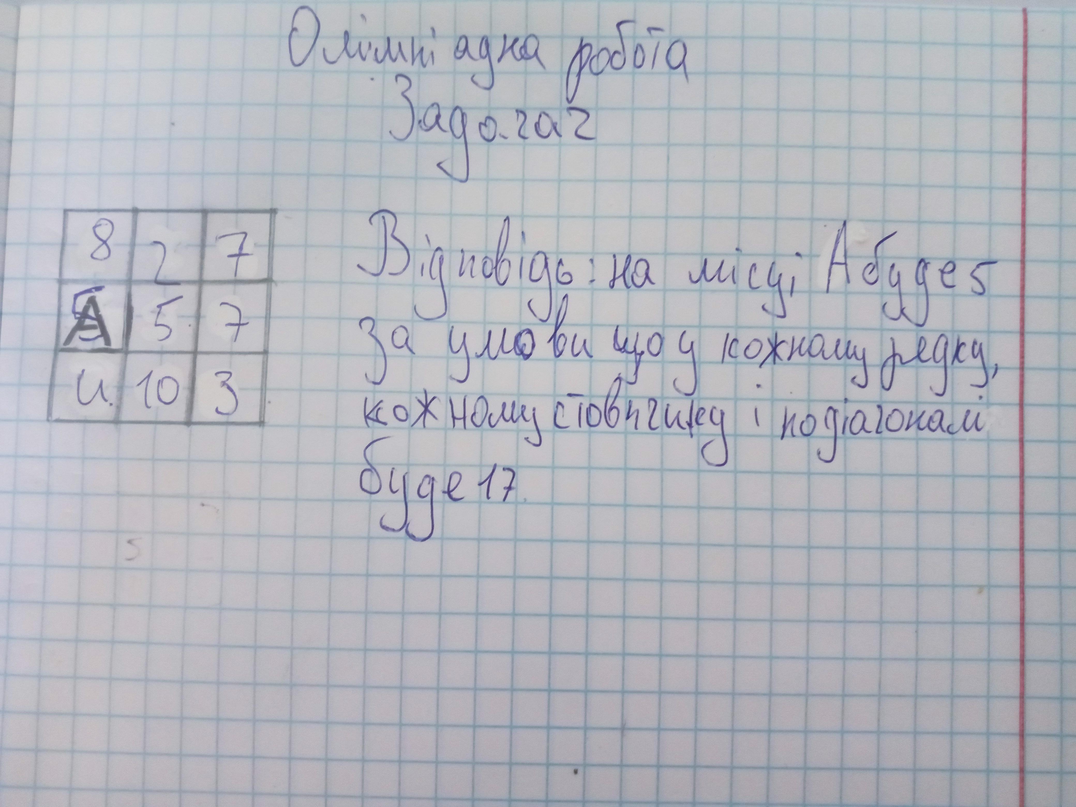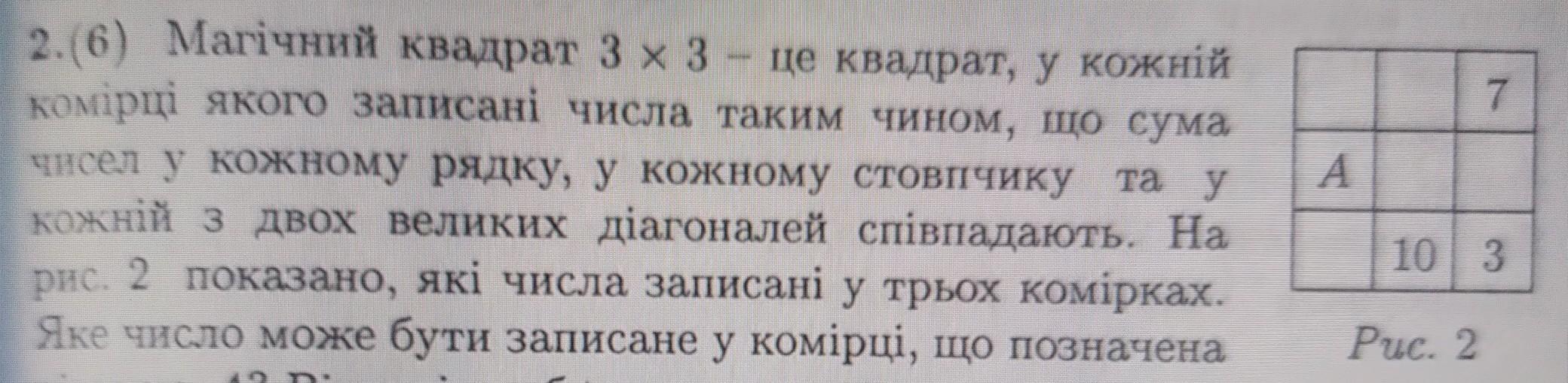 2.(6) Магiчний квадрат 3 × 3 - це квадрат, у кожній комірці якого записані числа таким чином, що сума чисел у кожному рядку, у кожному стовпчику та у кожній з двох великих діагоналей співпадають. На рис. 2 показано, якi числа записані у трьох комірках. Яке число може бути записане у комірці, що позначена літерою А? Відповідь обґрунтувати. A 7 10 3 Puc. 2