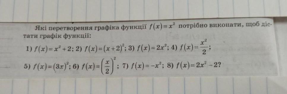 Які перетворення графіка функції f(x) = x² потрібно виконати, щоб діс- тати графік функції: 1) f(x)=x² +2; 2) f(x)=(x+2)*; 3) f(x)=2x²; 4) f(x)= 2 5) f(x)= (3x)²; 6) f(x) = (²) ; 7) f(x)=-x²; 8) f(x)=2x² -2? 2