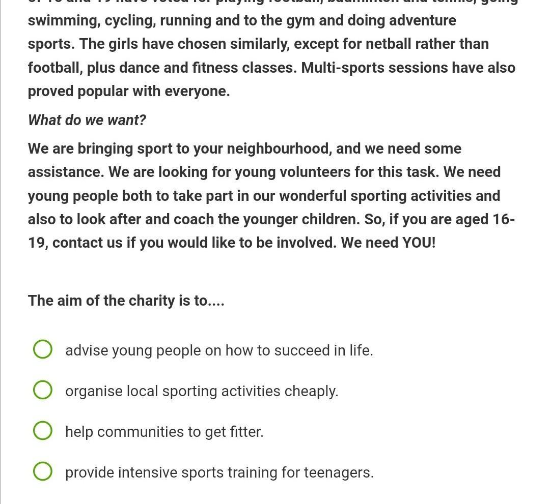like to be involved in, and these are the answers: boys between the ages of 16 and 19 have voted for playing football, badminton and tennis, going swimming, cycling, running and to the gym and doing adventure sports. The girls have chosen similarly, except for netball rather than football, plus dance and fitness classes. Multi-sports sessions have also proved popular with everyone. What do we want? We are bringing sport to your neighbourhood, and we need some assistance. We are looking for young volunteers for this task. We need young people both to take part in our wonderful sporting activities and also to look after and coach the younger children. So, if you are aged 16- 19, contact us if you would like to be involved. We need YOU! The aim of the charity is to.... advise young people on how to succeed in life. O organise local sporting activities cheaply. help communities to get fitter. provide intensive sports training for teenagers. Далее instagram.com PEKлAMA ||| O Завершить Go to site <