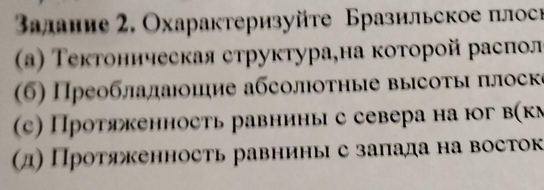 Объяснение: Бразильское плоскогорье занимает большую часть востока материка Южная Америка.Оно простирается с севера на юг на 3000 км, с запада на восток на 3200 км.Площадь территории около 5 млн.км².Наибольшая абсолютная высота-гора Бандейра 2890 м.Преобладающие высоты 1000-1500 м.