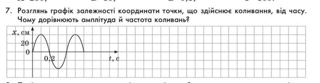 7. Розглянь графік залежності координати точки, що здійснює коливання, від часу. Чому дорівнюють амплітуда й частота коливань? X, CMT 20 0 0.2 ts