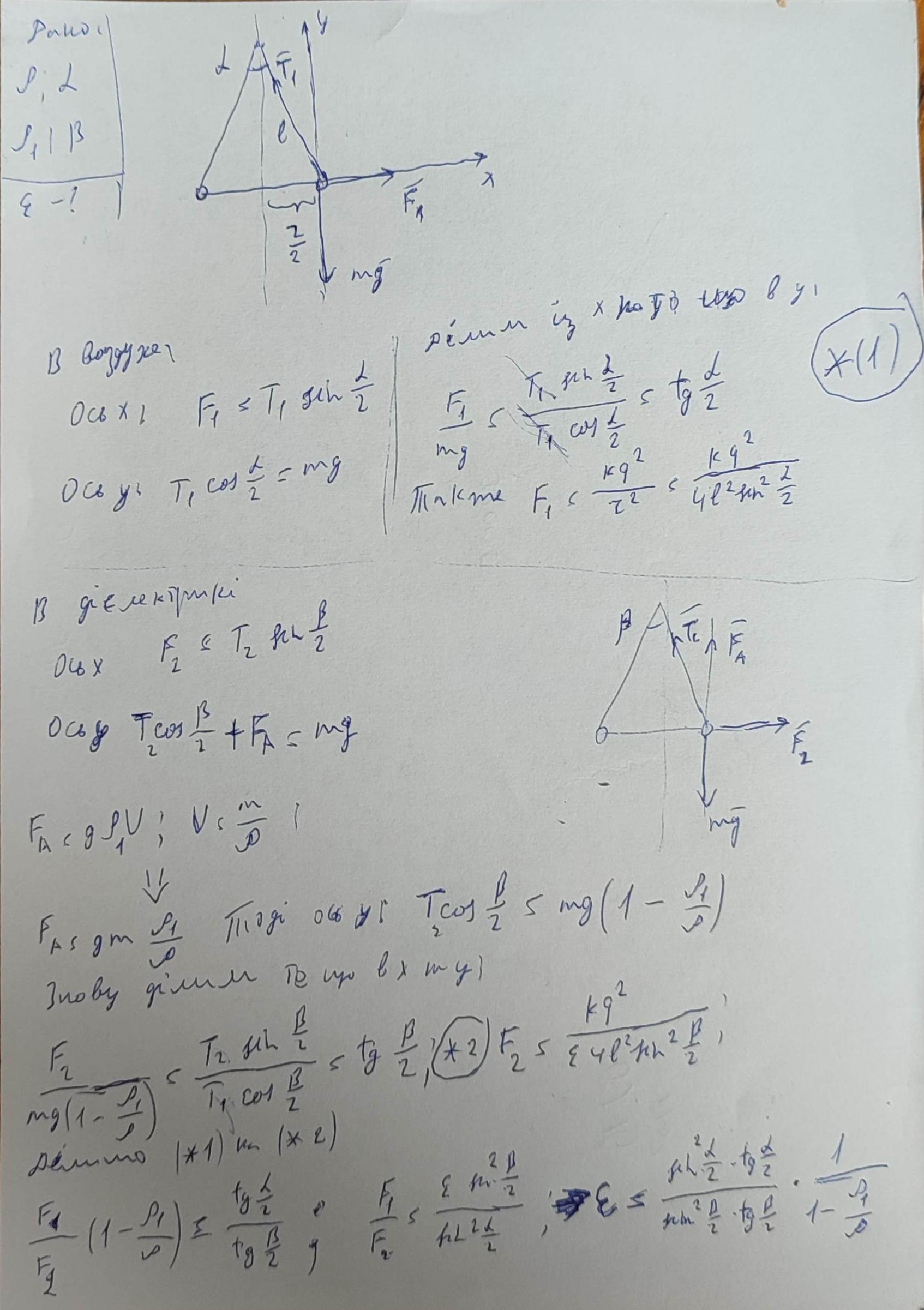 СРОЧНООО КТО УМНЫЙ.Дві однакові маленькі кулі густиною р висять на довгих шовкових нитках, закріплених в одній точці. Коли кулькам надали однакові за величиною і знаком електричні заряди, нитки розійшлися на кут а. Після цього кульки занурили в рідкий діелектрик, густина якого р1 Знайти діелектричну проникненість середовища, якщо кут розходження ниток у діелектрику В.