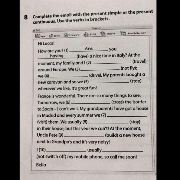 2) traveling 3) not flying 4) driving 5) stopping 6) crossing 7) visiting 8) staying 9) building 10)not switch offing