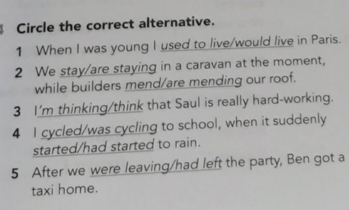 4 Circle the correct alternative. 2 1 When I was young I used to live/would live in Paris. We stay/are staying in a caravan at the moment, while builders mend/are mending our roof. 4 3 I'm thinking/think that Saul is really hard-working. I cycled/was cycling to school, when it suddenly started/had started to rain. 5 After we were leaving/had left the party, Ben got a taxi home.