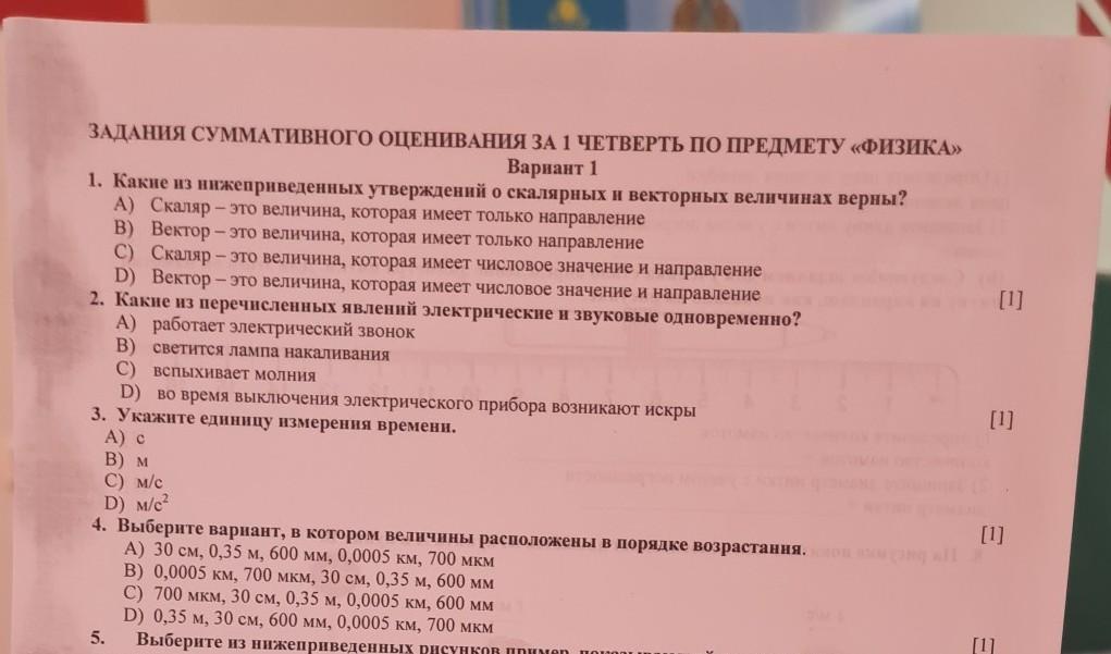 ЗАДАНИЯ СУММАТИВНОГО ОЦЕНИВАНИЯ ЗА 1 ЧЕТВЕРТЬ ПО ПРЕДМЕТУ «ФИЗИКА» Вариант 1 1. Какие из нижеприведенных утверждений о скалярных и векторных величинах верны? A) Скаляр - это величина, которая имеет только направление Вектор - это величина, которая имеет только направление B) Скаляр - это величина, которая имеет числовое значение и направление D) Вектор - это величина, которая имеет числовое значение и направление C) 2. Какие из перечисленных явлений электрические и звуковые одновременно? A) работает электрический звонок В) светится лампа накаливания С) вспыхивает молния D) во время выключения электрического прибора возникают искры 3. Укажите единицу измерения времени. А) с B) M С) м/с D) м/с² 4. Выберите вариант, в котором величины расположены в порядке возрастания. A) 30 см, 0,35 м, 600 мм, 0,0005 км, 700 мкм В) 0,0005 км, 700 мкм, 30 см, 0,35 м, 600 мм С) 700 мкм, 30 см, 0,35 м, 0,0005 км, 600 мм D) 0,35 м, 30 см, 600 мм, 0,0005 км, 700 мкм [1] [1] [1] [1 линейное