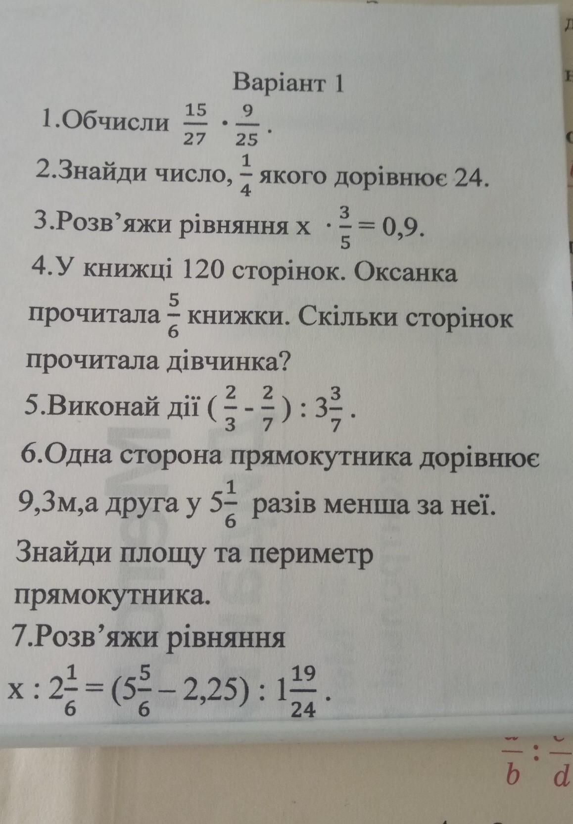 Варіант 1 15 9 1.Обчисли 27 25 1 2.Знайди число, якого дорівнює 24. - 4 3 3.Розв'яжи рівняння х = 0,9. 5 4. У книжці 120 сторінок. Оксанка 5 прочитала - книжки. Скільки сторінок 6 • прочитала дівчинка? 2 5.Виконай дії ( 3 - 3 ) : 33, 6.Одна сторона прямокутника дорівнює 5¹12 9,3м,а друга у разів менша за неї. 6 Знайди площу та периметр прямокутника. 7. Розв'яжи рiвняння 6 19 х: :2²=(5--2,25): 124 6