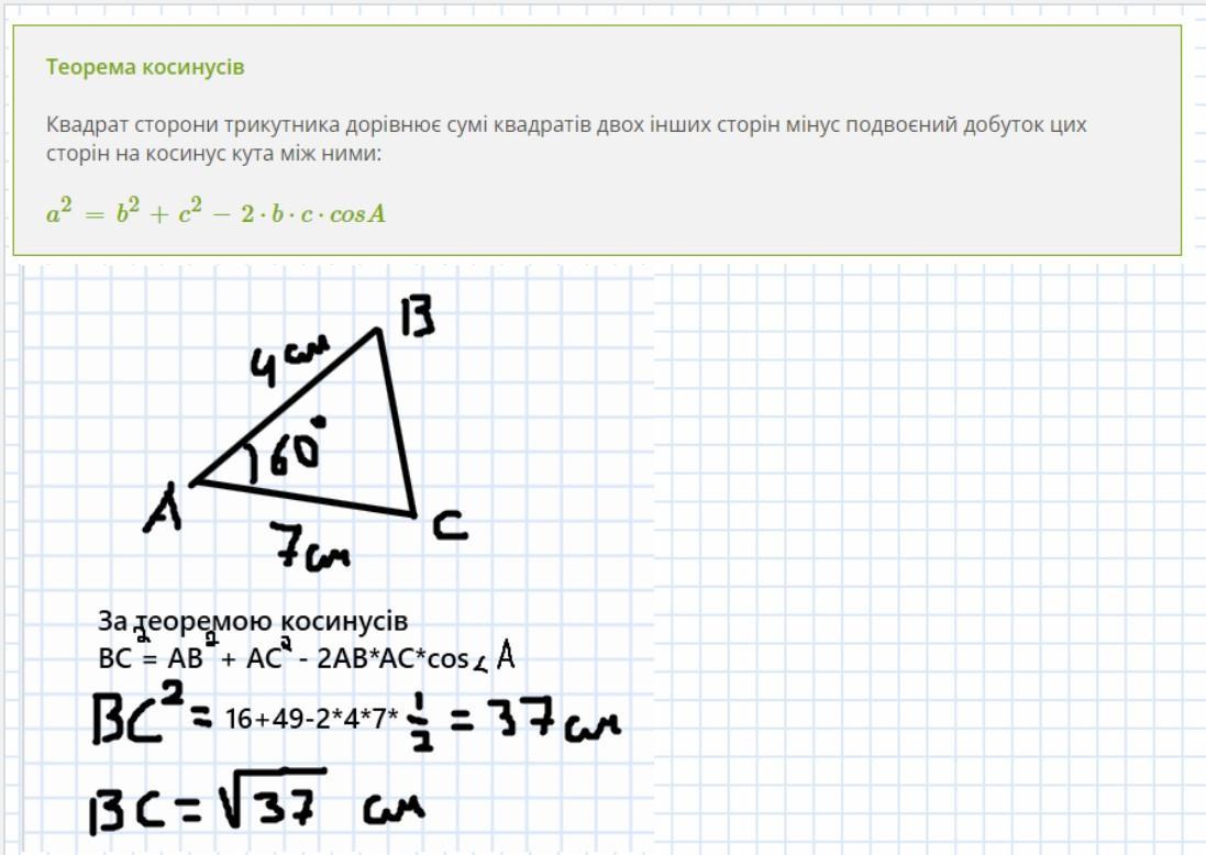 СРОЧНО ПОЖАЛУЙСТА!!!!Знайти третю сторону трикутника, якщо дві з них дорівнюють 4 см і 7 см, а кут між ними дорівнює 60 градусів (за теоремою косинусів)