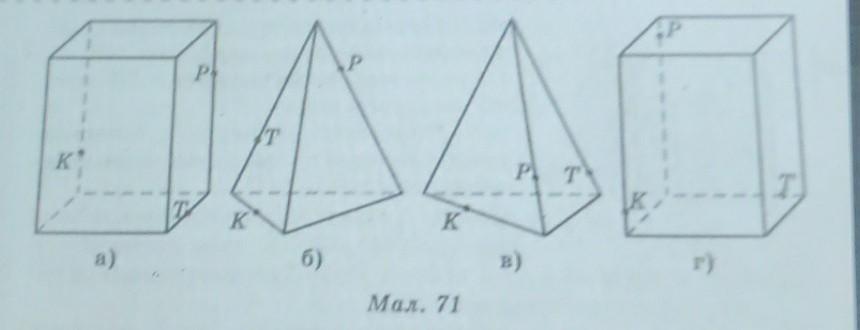 Накресліть малюнок 71 , а-г у зошит і на кожному з них побудуйте переріз многогранника площиною, яка проходить через точки К, Р , Т