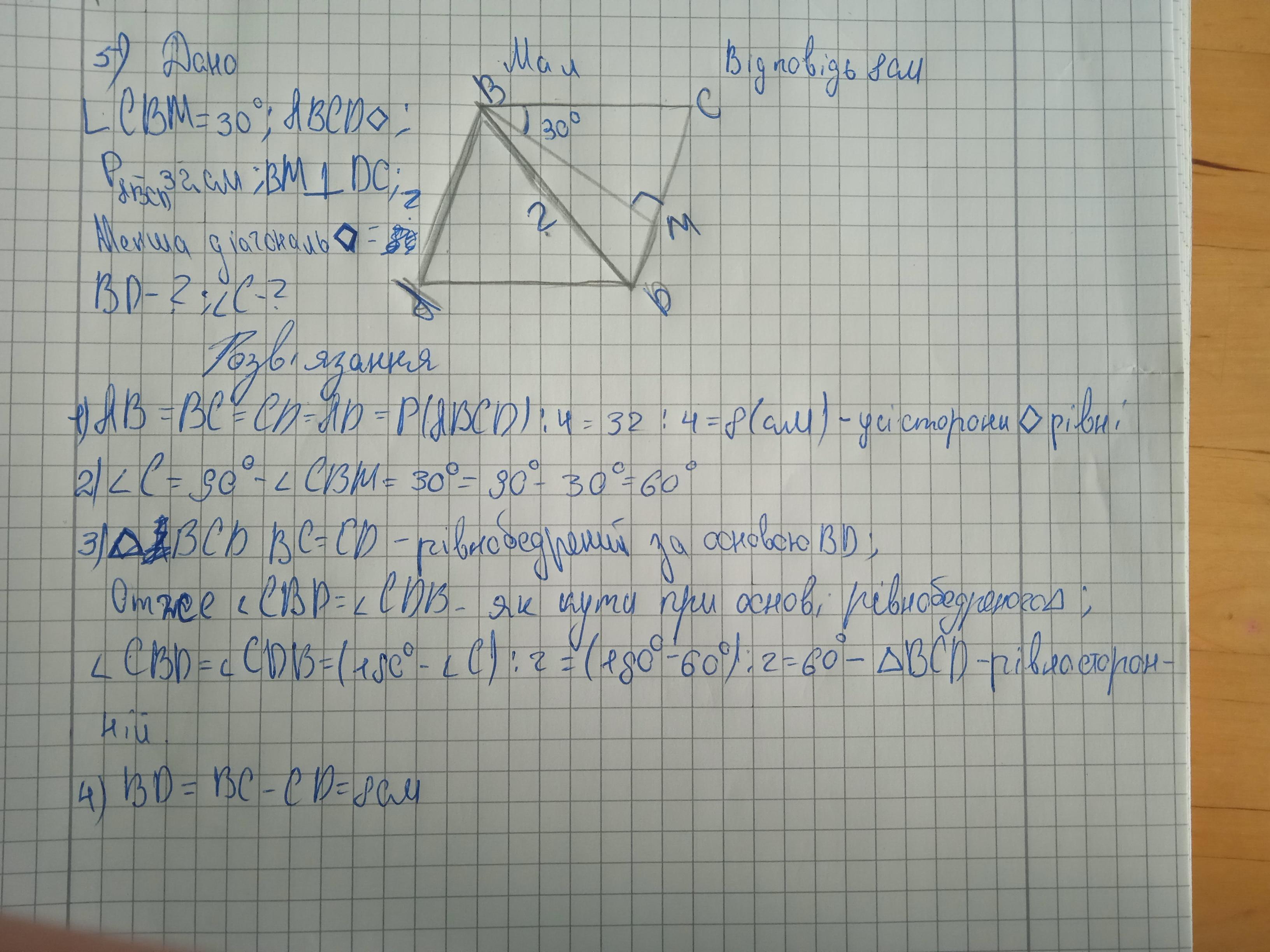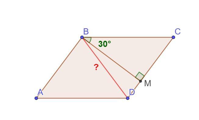 Нехай маємо ромб ABCD, Р(ABCD)=32 см, ВМ⊥DC, ∠СВМ=30°.