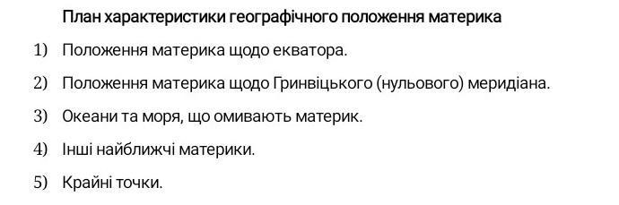 4. Найближчий материк до Африки це Євразія, іх віддяліє Гібралтарська протока та у Суєцькому каналу, ці протоки з'єднані Середземним морем. Через Антлантичний Океан знаходиться Південна Америка, а ще далі Північна Америка. Через Індійський знаходиться Австралія, а з Південного океану Антарктида.