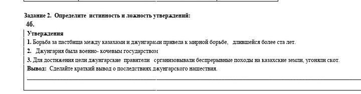 Задание 2. Определите истинность и ложность утверждений: 46. Утверждения 1. Борьба за пастбища между казаками и джунгарами привела к мирной борьбе, длившейся более ста лет. 2. Джунгария была военно-кочевым государством 3. Для достижения цели джунгарские правители срганизовывали беспрерывные походы на казахские земли, угоняли скот. Вывод: Сделайте краткий вывод о последствиях джунгарского нашествия.