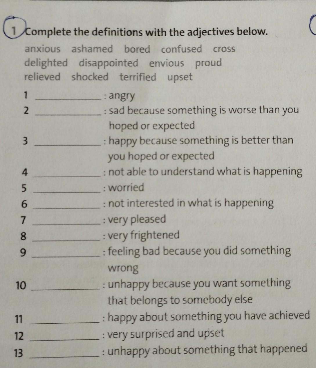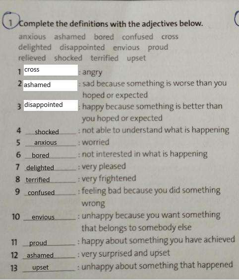 compl Complete the definitions with the adjectives below. 1 2 anxious ashamed bored confused cross delighted disappointed envious proud relieved shocked terrified upset 3 11 12 13 4 6 777557 8 9 10 :angry : sad because something is worse than you hoped or expected : happy because something is better than you hoped or expected : not able to understand what is happening : worried : not interested in what is happening : very pleased very frightened : feeling bad because you did something wrong unhappy because you want something that belongs to somebody else G : happy about something you have achieved : very surprised and upset : unhappy about something that happened