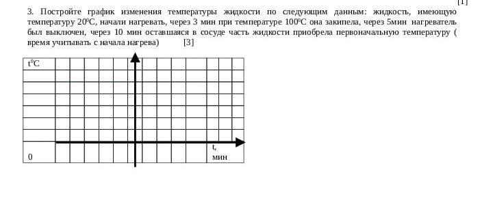 3. Постройте график изменения температуры жидкости по следующим данным: жидкость, имеющую температуру 20ºС, начали нагревать, через 3 мин при температуре 100ºC она закипела, через 5мин нагреватель был выключен, через 10 мин оставшаяся в сосуде часть жидкости приобрела первоначальную температуру ( время учитывать с начала нагрева) [3] tºC 0 t, МИН
