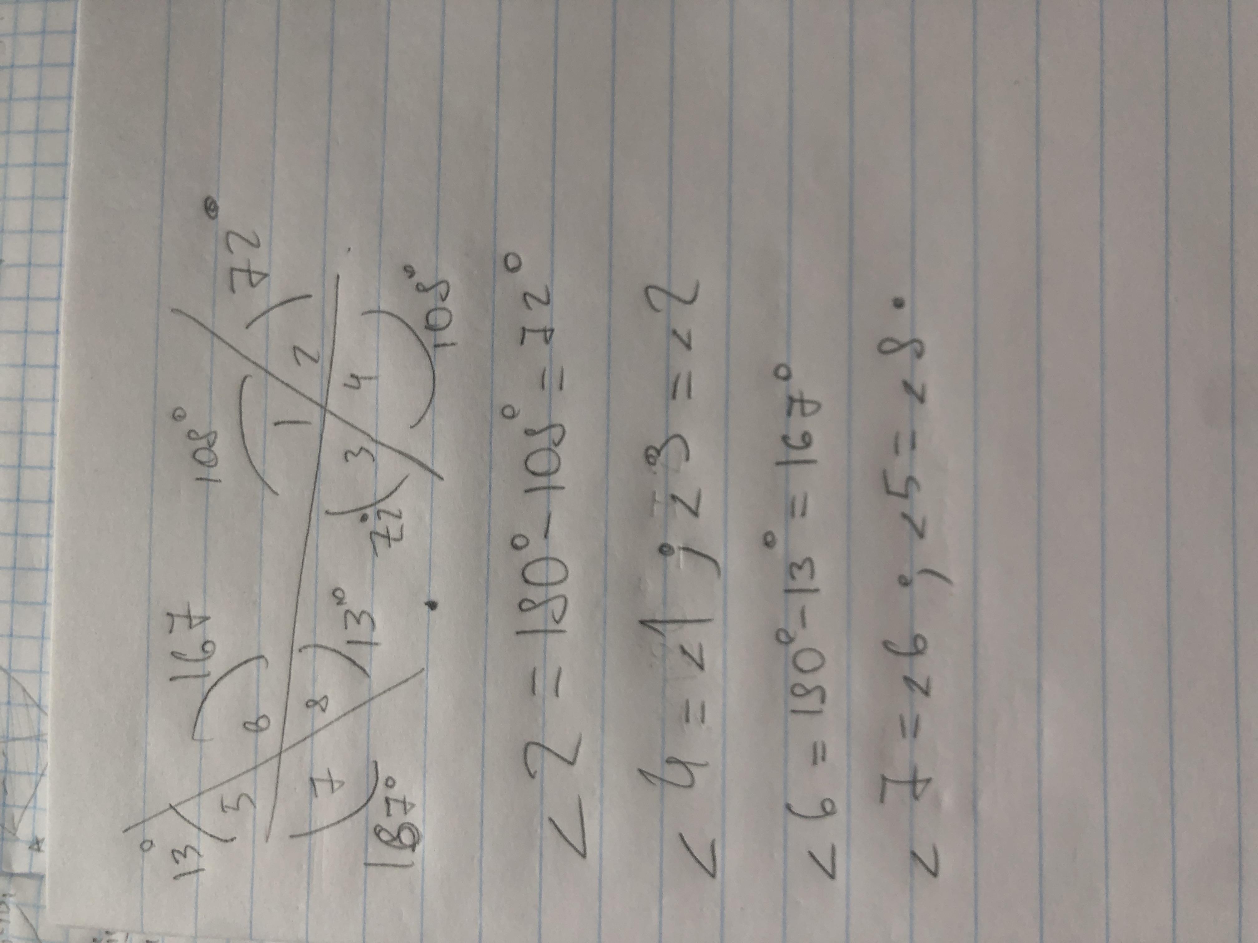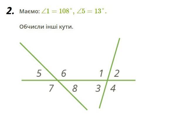 Маємо: <1 = 108°, <5 = 13°. Обчисли інші кути. Доможіть будь ласка!!! Дам 25 балів