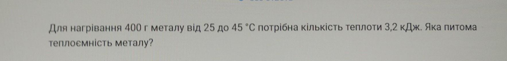 Для нагрівання 400 г металу від 25 до 45 °С потрібна кількість теплоти 3,2 кДж. Яка питома теплоємність металу?