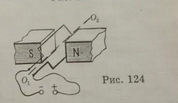 В якому напрямі почне обертатися дротяна рамка зі струмом, зображена на рис. 124? Чи повертатиметься рамка, якщо б вона перебувала у горизонтальному положенні, у вертикальному положенні?