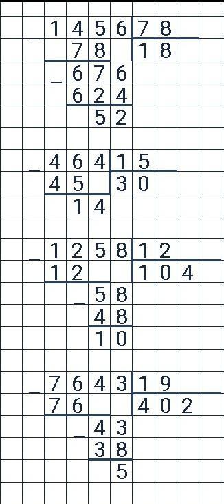 Виконай ділення з остачею Та зроби перевірку1) 1456÷78 2) 464÷15 3) 1258÷12 4) 7643÷19. В стопчик пожалуста срочно