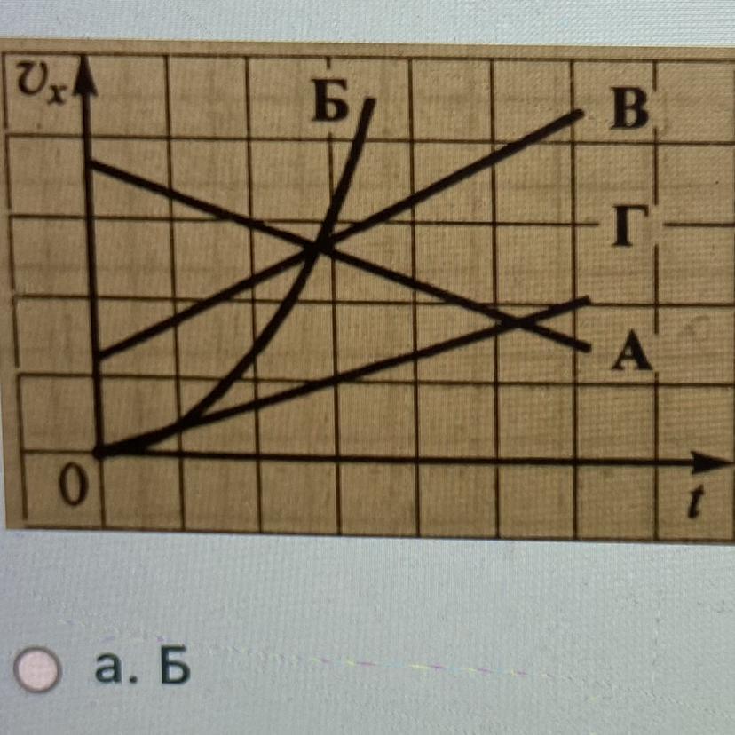 Графік проекції швидкості при рівноприскореному pyci є прямою лінією, нахиленою під певним кутом до осі часу. Графік Б є параболою, тому він не може бути графіком проекції швидкості при рівноприскореному pyci.