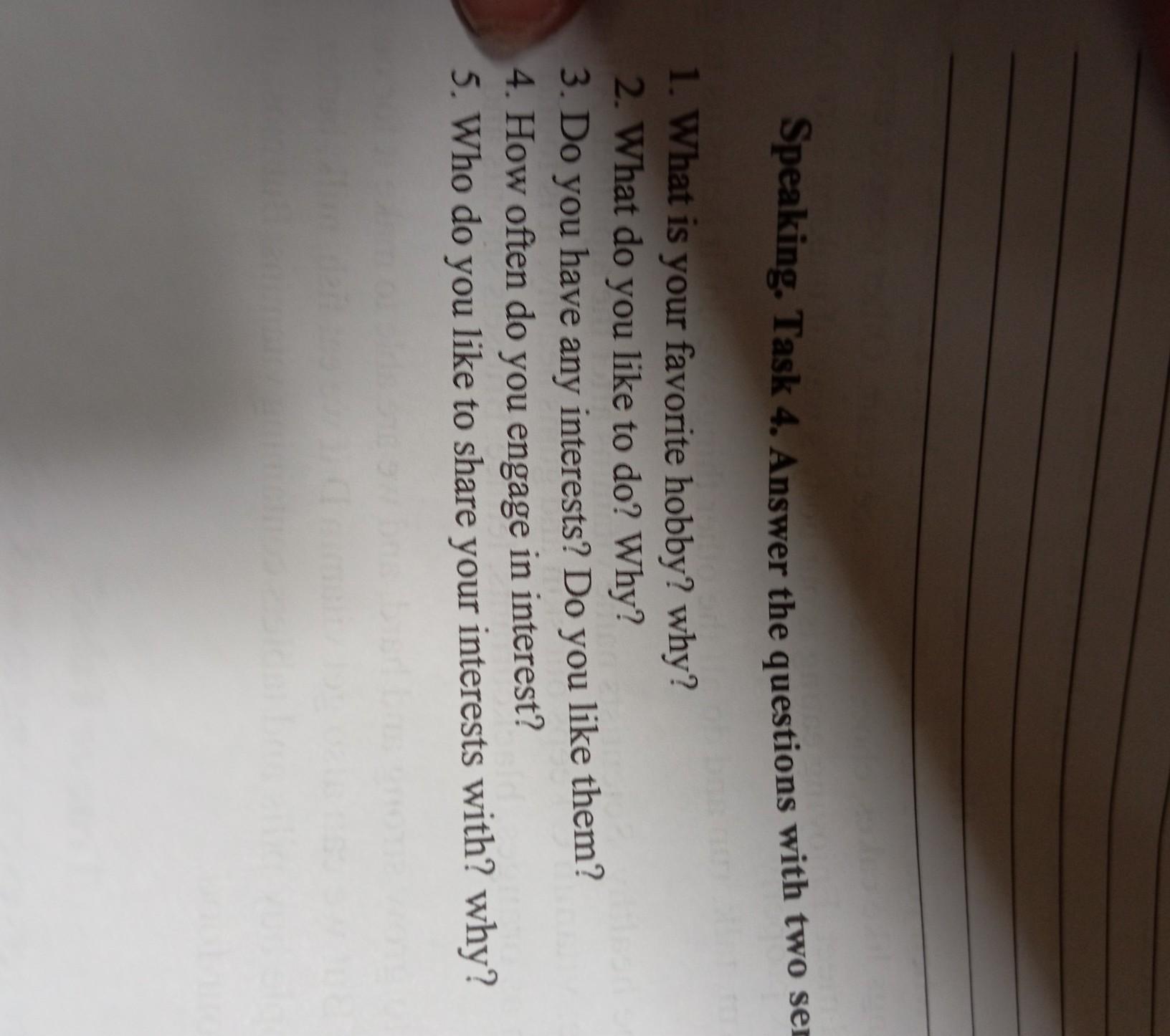 Speaking. Task 4. Answer the questions with two sentences. 1. What is your favorite hobby? why? 2. What do you like to do? Why? 3. Do you have any interests? Do you like them? 4. How often do you engage in interest? 5. Who do you like to share your interests with? why?