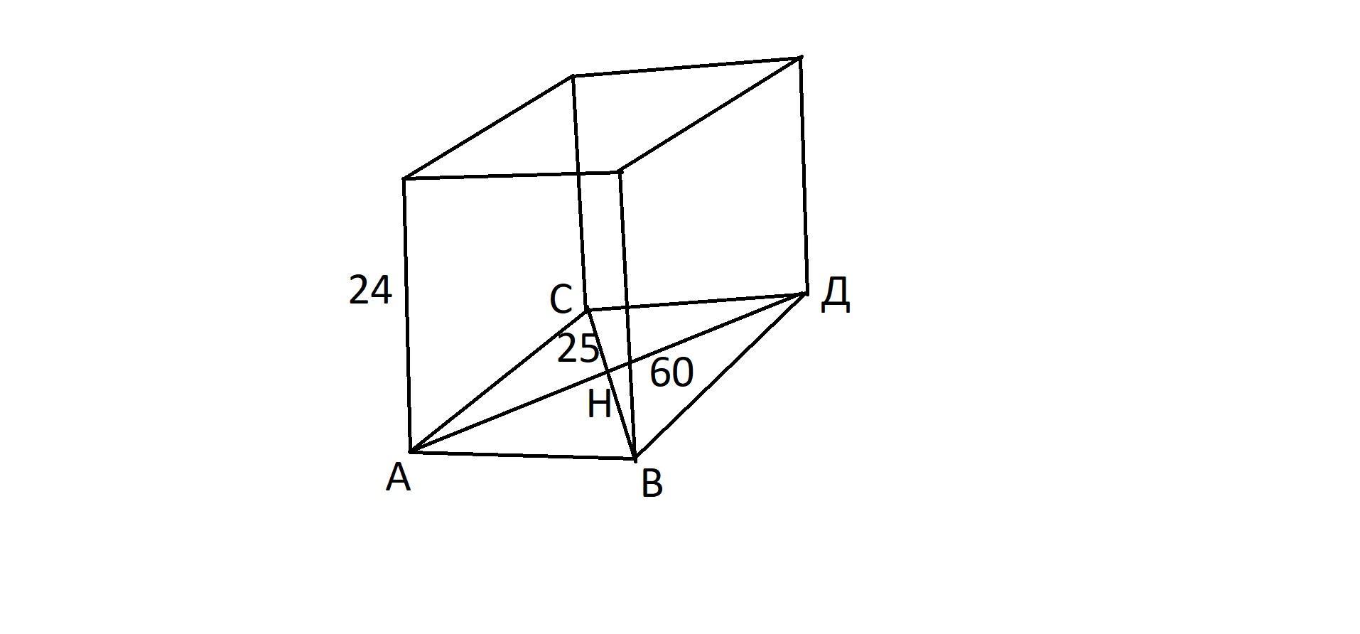 Знайди площу поверхні прямої призми, в основі якої лежить ромб з діагоналями рівними 25 см та 60 см та бічним ребром, рівним 24 см.