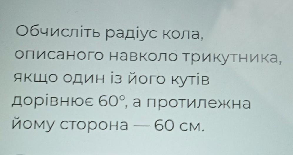 Обчисліть радіус кола, описаного навколо трикутника, якщо один із його кутів дорівнює 60°, а протилежна йому сторона — 60 см.
