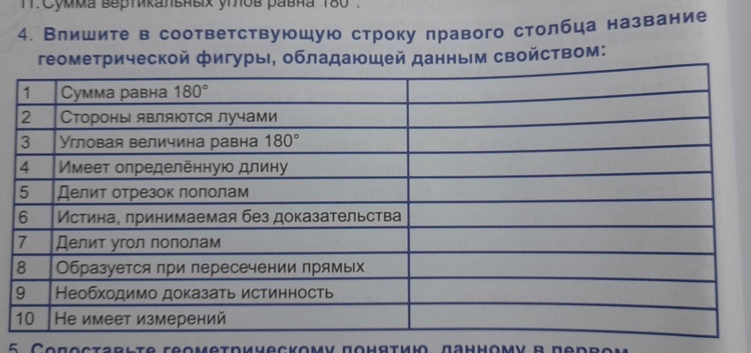 4. Впишите в соответсвующую строку правого столбца названия геометрической фигуры, обладающей данным свойством.