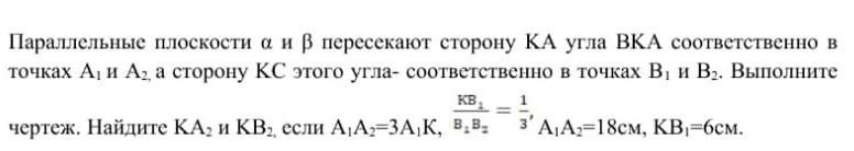 Параллельные плоскости α и β пересекают сторону КА угла ВКА соответственно в точках А₁ и А₂, а сторону КС этого угла -соответственно в точках В₁ и В₂. Выполните чертеж. Найдите КА₂ и КВ₂, если А₁А₂-ЗА₁К, КВ₁/В₁В₂=1/3, А₁А₂=18 см,КВ₁=6см