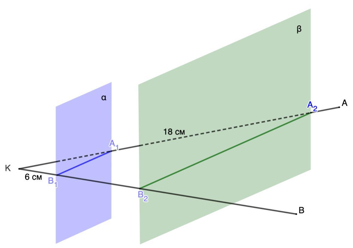 Параллельные плоскости α и β пересекают сторону КА угла ВКА соответственно в точках А₁ и А₂, а сторону КВ этого угла - соответственно в точках В₁ и В₂. Выполните чертеж. Найдите КА₂ и КВ₂, если А₁А₂=3А₁К, КВ₁/В₁В₂ = 1/3, А₁А₂ = 18 см, КВ₁ = 6 см.