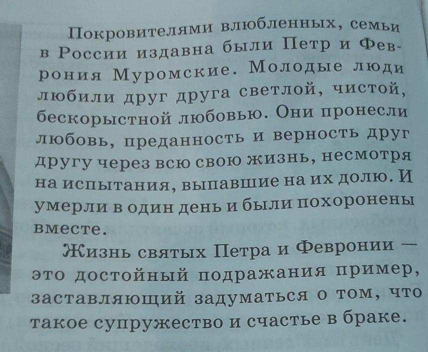 Вот первое предложение:8 июля в Росси празднуется День Петра и Февронии - День семьи,любви и верности.Просто оно не умистилось.