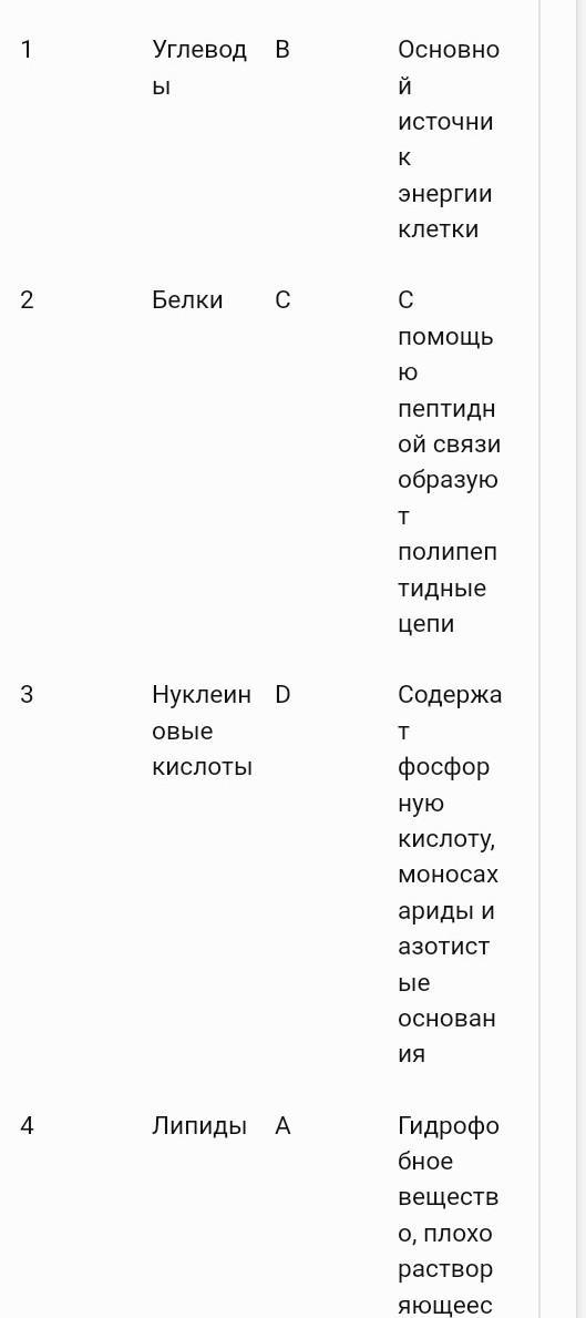Распо 3. Определите соответствие органических веществ с их свойствами, приведён- ными в таблице. П/н Органические вещества 1 Углеводы 2 Белки 3 Нуклеиновые кислоты 4 Липиды Ответ A Б Свойства Гидрофобное вещество, плохо растворяющееся в Г воде С помощью пептидной связи образуют полипептидные цепи B Основной источник энергии клетки Содержит фосфорную кислоту, моносахариды и азотистые основания с их свойствами.