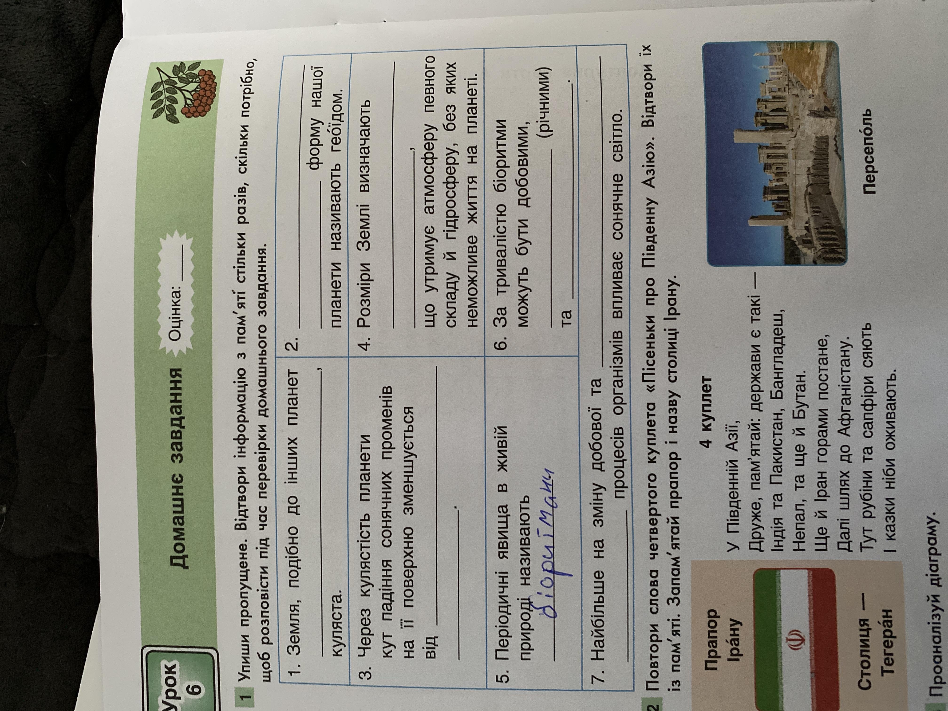 Упиши пропущене. Відтвори інформацію з пам'яті стільки разів, скільки потрібно, щоб розповісти під час перевірки домашнього завдання. 1. Земля, подібно до iнших планет 2. Геометрично Сонячної системи, 3. Через кулястість планети кут падіння сонячних променів На її поверхню зменшується 5. явища в живій природі називають біоритмами. 4. форму нашої планети називаюТЬ визначають силу земного тяжіння, що утримує атмосферу певного складу й гідросферу, без яких неможливе життя на планеті. 6. За тривалістю біоритми можуть бути (річними) та багаторічними. 7. Найбільше на зміну добової та сезонної активності життєвих процесів органiзмiв впливае БУДЬ ЛАСКА ДОПОМОЖІТЬ