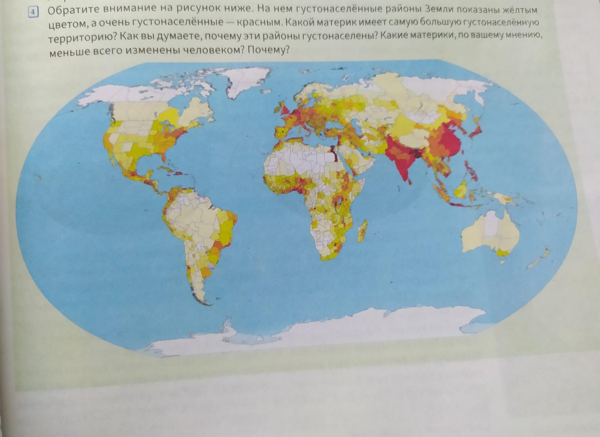 Обратите внимание на рисунок ниже.На нём густонаселённые районы Земли показано жёлтым цветом,а очень густонаселённый-красным Какой материк имеет самую большую густонаселённых территорию?Как вы думаете почему эти районы густонаселённая?Какие материки по вашему мнению меньше всего изменена человеком?Почему?