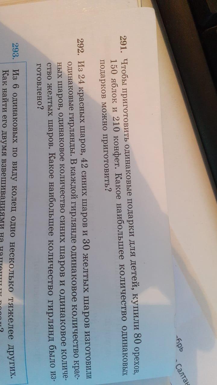 291.делитель (НОД) для количества орехов (80), яблок (150) и конфет (210).