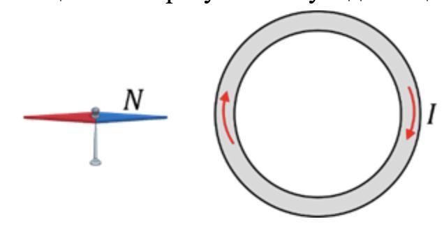 У якому напрямку повернеться північний полюс магнітної стрілки, якщо вона перебуває збоку від кільцевого струму?