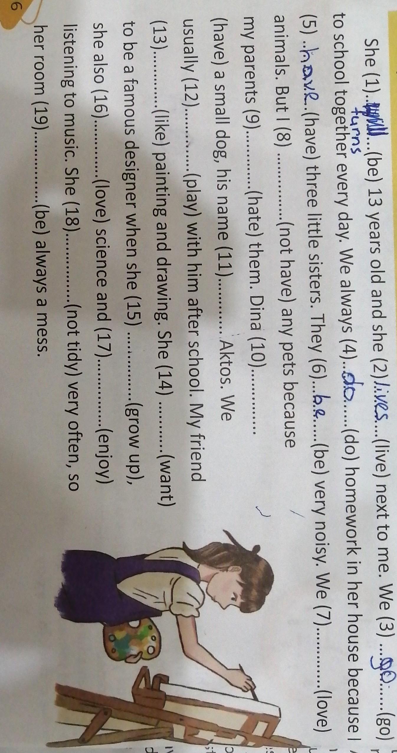 She is 13 years old and she lives next to me. We go to school together every day. We always do homework in her house because I