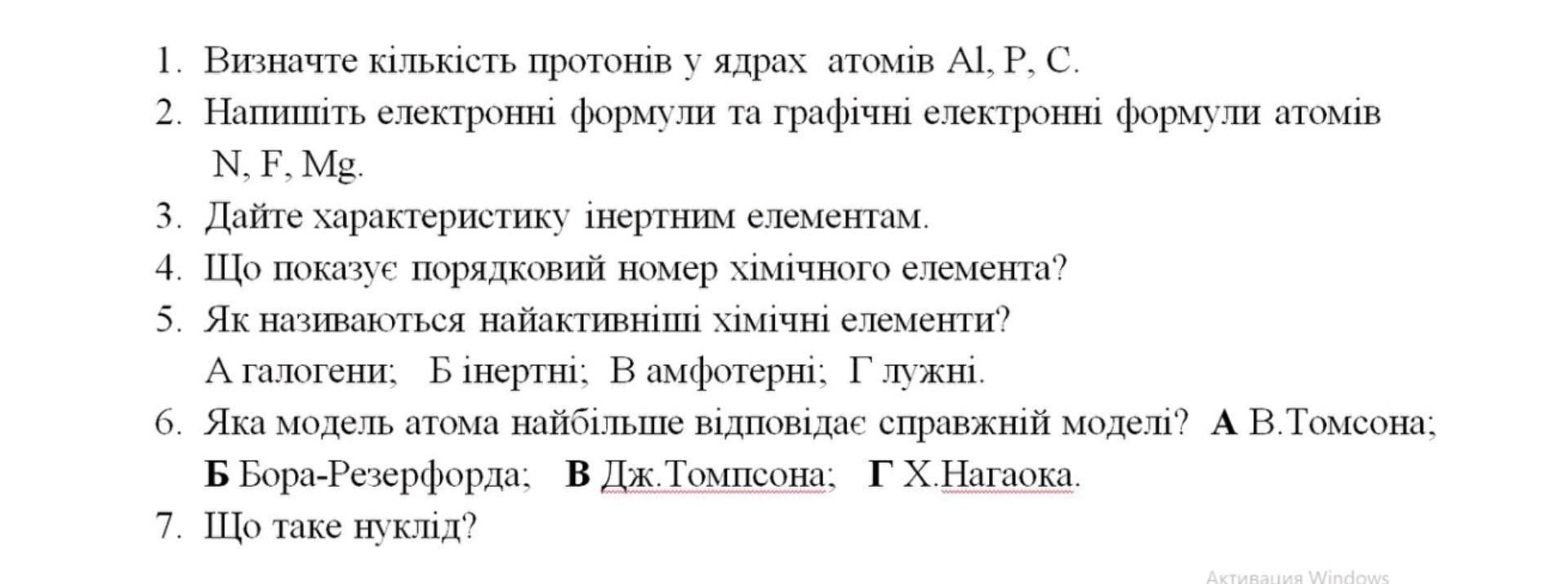 Визначте кількість протонів у ядрах атомів Al, P, C. Напишіть електронні формули та графічні електронні формули атомів N. F, Mg. Дайте характеристику інертним елементам. Що показує порядковий номер хiмiчного елемента? Як називаються найактивніші хімічні елементи? А галогени, Б інертні; в амфотерні; Г лужні. Яка модель атома найбільше відповідає справжній моделі? A B.Томсона; Б Бора-Резерфорда; В Дж.Томпсона; ГХ.Нагаока. Що таке нуклід? Даю 40 балов!!!