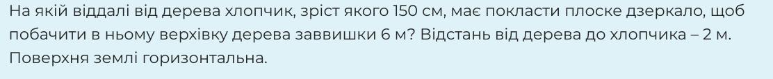 Позначимо відстань від хлопчика до дзеркала як х. Тоді, за подібністю трикутників, відстань від дзеркала до верхівки дерева дорівнює: