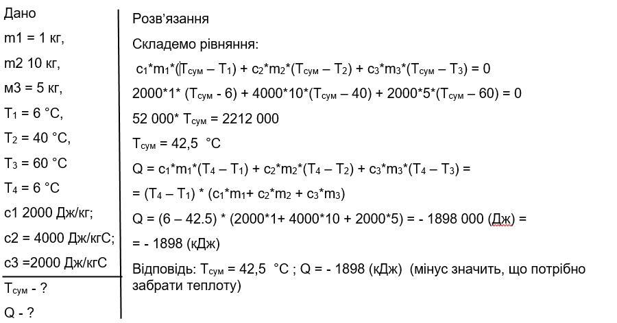 8. (4 бали)В посудині змішується три рідини, які хімічно не взаємодіють поміж собою. Маси рідин відповідно дорівнюють m1 = 1 кг, m2 10 кг, м3 = 5 кг, температури t1 = 6 °C, t2 = 40 C, t3 = 60 'C, питома теплоємностi c1 2000 Дж/кг; c2 = 4000 Дж/кгС; c3 =2000 Дж/кгC. Знайти температуру даної суміші та кількість теплоти, потрібну для підігрівання суміші до 6 °C. Дані рідини не кристалізуються, втратами тепла знехтувати