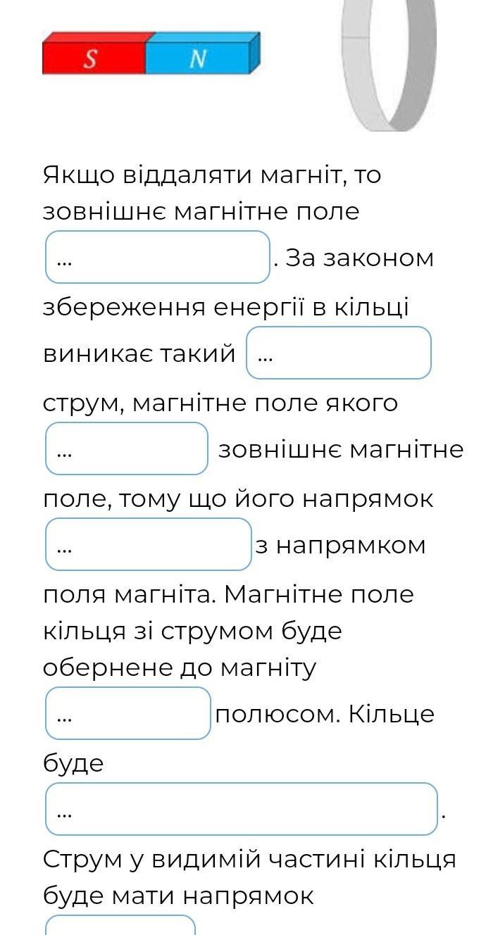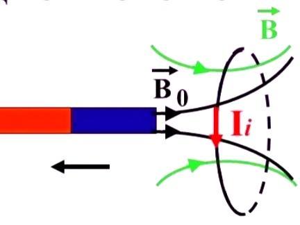 У магнита есть поле. Его силовые линии выходят из северного полюса N. Черные линии Во. Если магнит удалять, то поле будет ослабевать. Тогда в замкнутом витке возникнет индукционный ток, направление которого показано красной стрелкой, вниз. По правилу буравчика его зелёные силовые линии В направлены в туже сторону, что и поле магнита. Поле витка всегда препятствует изменению поля магнита.