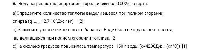 а) Определите количество теплоты выделившееся при полном сгорании спирта (Qспирта=2,7-10² Дж/кг)
