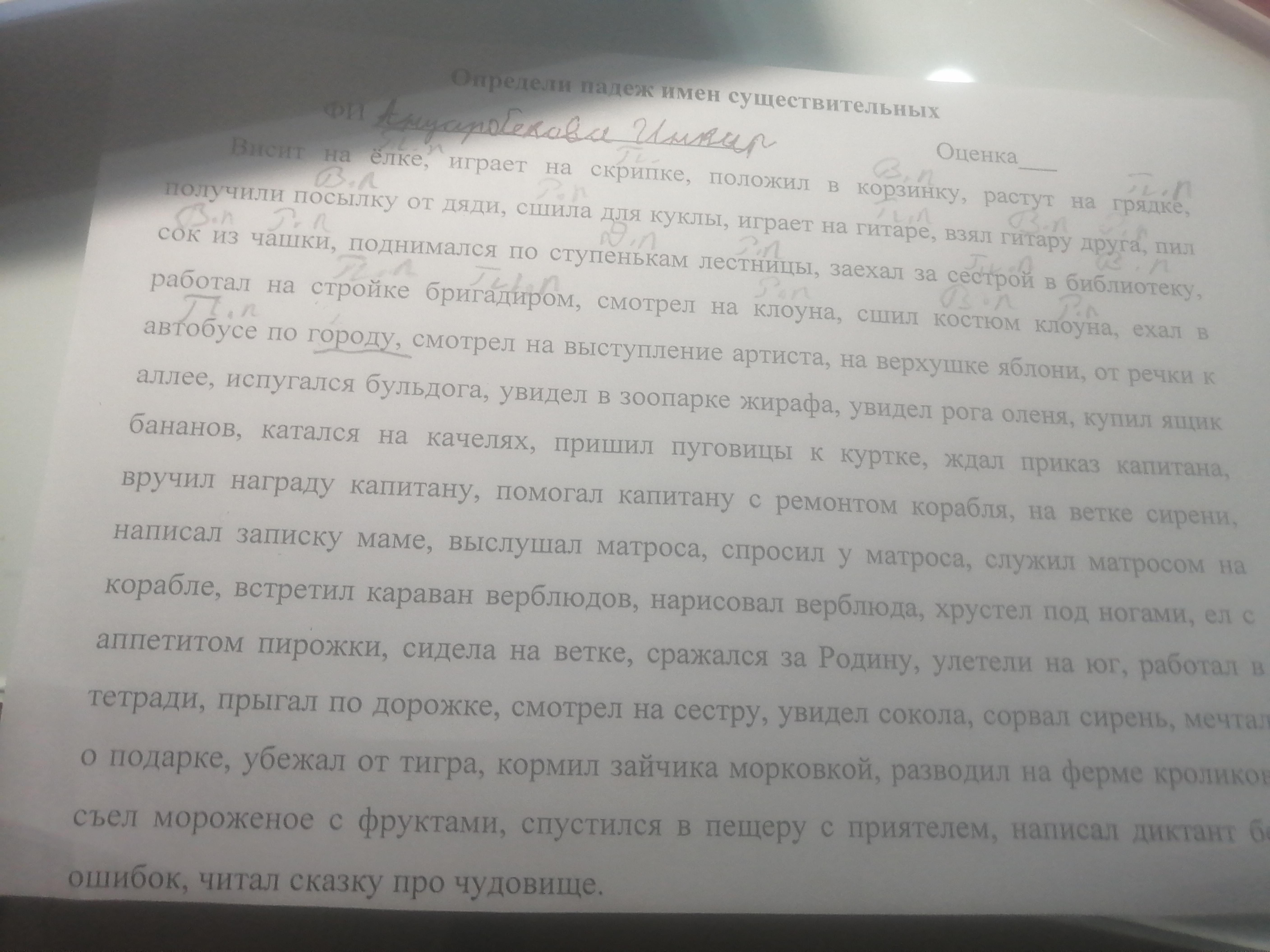 Висит на ёлке(Т.п.),играет на скрипке(Т.п.),положил в корзинку (В.п),растут на грядке (П.п),получили посылку(И.п.) от дяди(р.п.),сшила для куклы(р.п.),играет на гитаре (п.п.),взял гитару(и.п) друга(п.п),пил сок(и.п) из чашки(р.п.),поднимался по ступенькам (д.п.)лестницы (р.п),заехал за сестрой(т.п) в библиотеку,работал на стройке (п.п.) бригадиром(т.п.),,смотрел на клоуна(р.п.),сшил костюм(и.п.) клоуна (р.п.),ехал в автобусе (п.п) по городу(д.п.),смотрел на выступление (в.п.) артиста( р.п),на верхушке(п.п) яблони(р.п),от речки(р.п) к аллее(д.п),испугался бульдога(р.п),увидел в зоопарке (т.п.) жирафа(р.п),,увидел рога(и.п) оленя(р.п),купил ящик(и.п.) бананов(р.п.),катался на качелях(п.п),пришил пуговицы(и.п) к куртке(д.п),ждал приказ(и.п) капитана(р.п),вручил награду(и.п) капитану(д.п),помогал капитану(д.п) с ремонтом (т.п) корабля(р.п),на ветке(п.п) сирени(р.п),написал записку(и.п) маме(д.п),выслушал матроса(р.п),спросил у матроса(р.п),служил матросом(т.п) на корабле(п.п),встретил караван (и.п) верблюдов(р.п),хрустел под ногами(т.п),ел с аппетитом (т.п) пирожки(и.п), сидела на ветке(т.п),сражался за Родину(в.п),улетали на юг(и.п),работал в тетради(п.п),прыгал по дорожке(д.п),смотрел на сестру(р.п),увидел сокола(р.п),сорвал сирень(и.п),мечтал о подарке(п.п),убежал от тигра(р.п),кормил зайчика(р.п) морковкой(т.п),разводил на ферме(п.п) кроликов(р.п),съел мороженное (и.п) с фруктами,спустился в пещеру (в.п) с приятелем(т.п),написал диктант(и.п) без ошибок(р.п),читал сказку(и.п.) без ошибок(р.п).