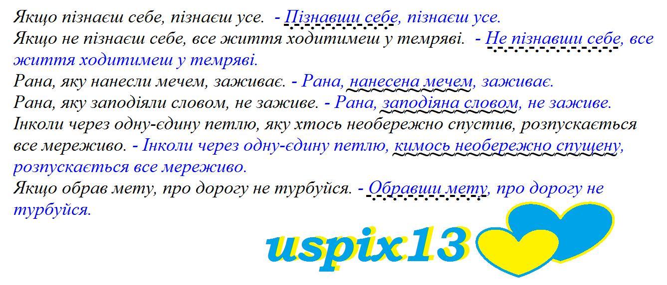 8. перебудуйте на прості, Подані складні речення ускладнені дієприкметниковими або дієприслівниковими зворотами. Якщо пізнаєш себе, пізнаєш усе. Якщо не пізнаєш себе, все життя ходитимеш у темряві. Рана, яку нанесли мечем, заживає. Рана, яку заподіяли словом, не заживе. Інколи через одну-єдину петлю, яку хтось необережно спустив, розпускається все мереживо. Якщо обрав мету, про дорогу не турбуйся.