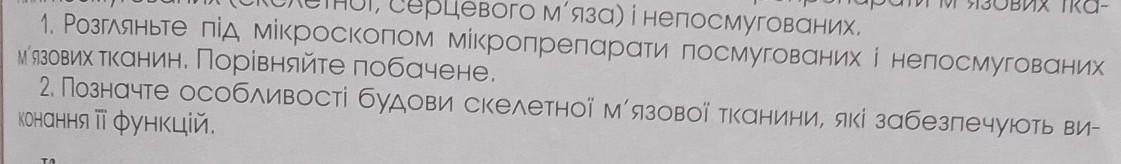 1. Розгляньте під мікроскопом мікропрепарати посмугованих не м'язових тканин. Порівняйте побачене. 2. Позначте особливості будови скелетноï м'язової тканини, які забезпечують ви- конання її функцій.