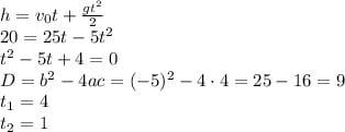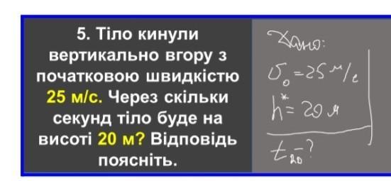 Тіло кинули Вертикально вгору з початковою швидкістю 25 м/с. Через скільки секунд тіло буде на висоті 20 м? Відповідь поясніть. Дано на фото