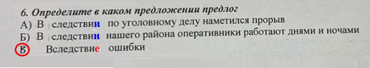 6. Определите в каком предложении предлог А) (В)следстви... по уголовному делу наметился прорыв Б) (В)следстви... нашего района оперативники работают днями и ночами В) (В) следстви... ошибки